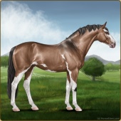 Name: EEE Art Of StarsAge: 12 Mare Color: Golden Bay Dun Tobiano Sabino Breed: Sport Horse Foal Rating: E/E/E |  |